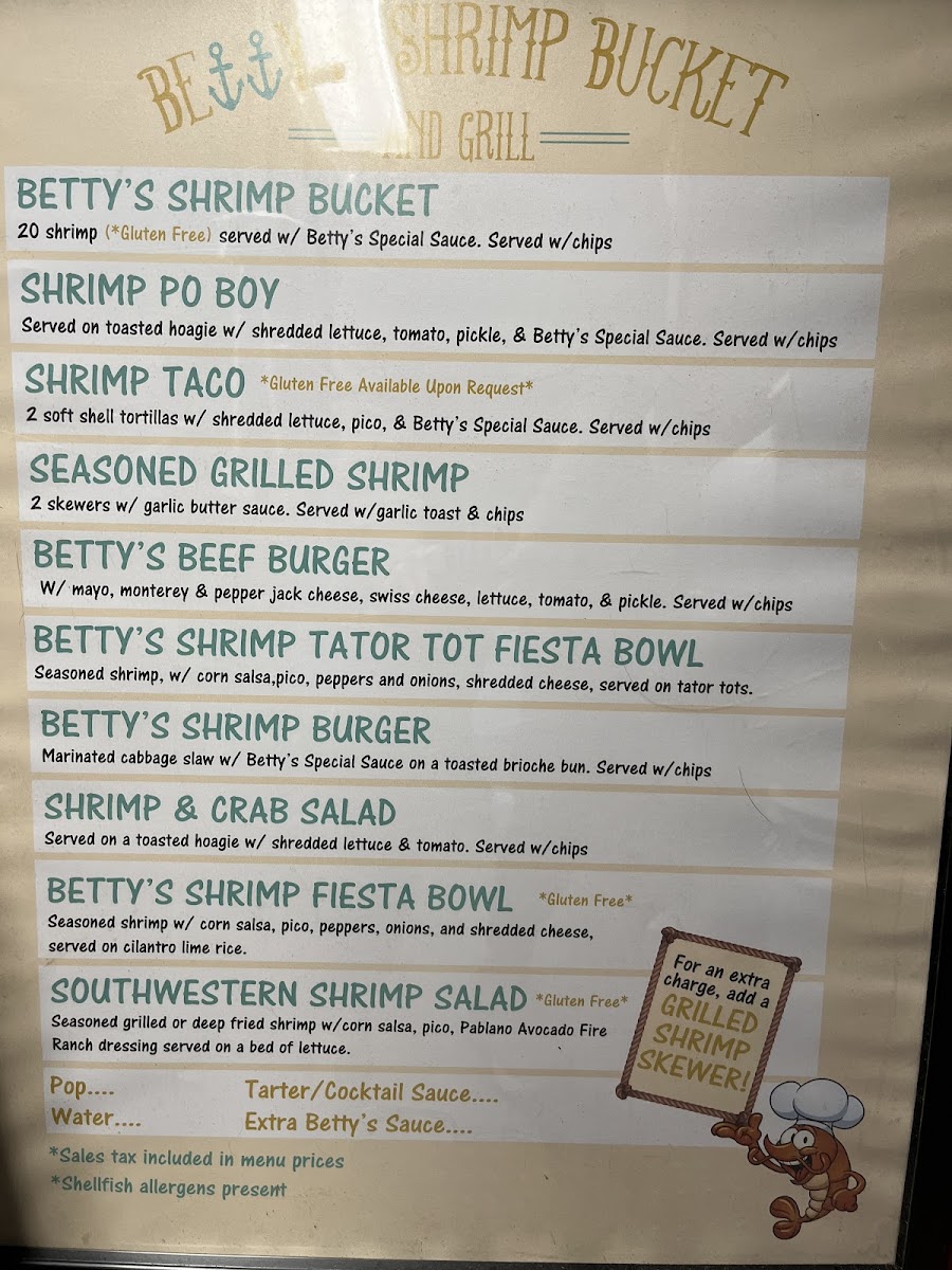 Betty's Shrimp Bucket and Grill offers a diverse and enticing menu that showcases the best of fresh seafood with a focus on shrimp dishes. Among the standout items, the Shrimp Tacos are a fan favorite, offering a perfect balance of flavorful seasoning and crispy shrimp, all wrapped in soft tortillas. For those craving something heartier, the Shrimp PO Boy delivers a satisfying combination of golden-fried shrimp, lettuce, tomato, and tangy sauce, all tucked into a soft roll. The menu also features a variety of other seafood options, including classic fried shrimp baskets and rich shrimp and grits, ensuring there’s something for every seafood lover. With its casual yet vibrant atmosphere, Betty's Shrimp Bucket and Grill serves up a menu full of bold, flavorful dishes that are sure to satisfy any appetite.